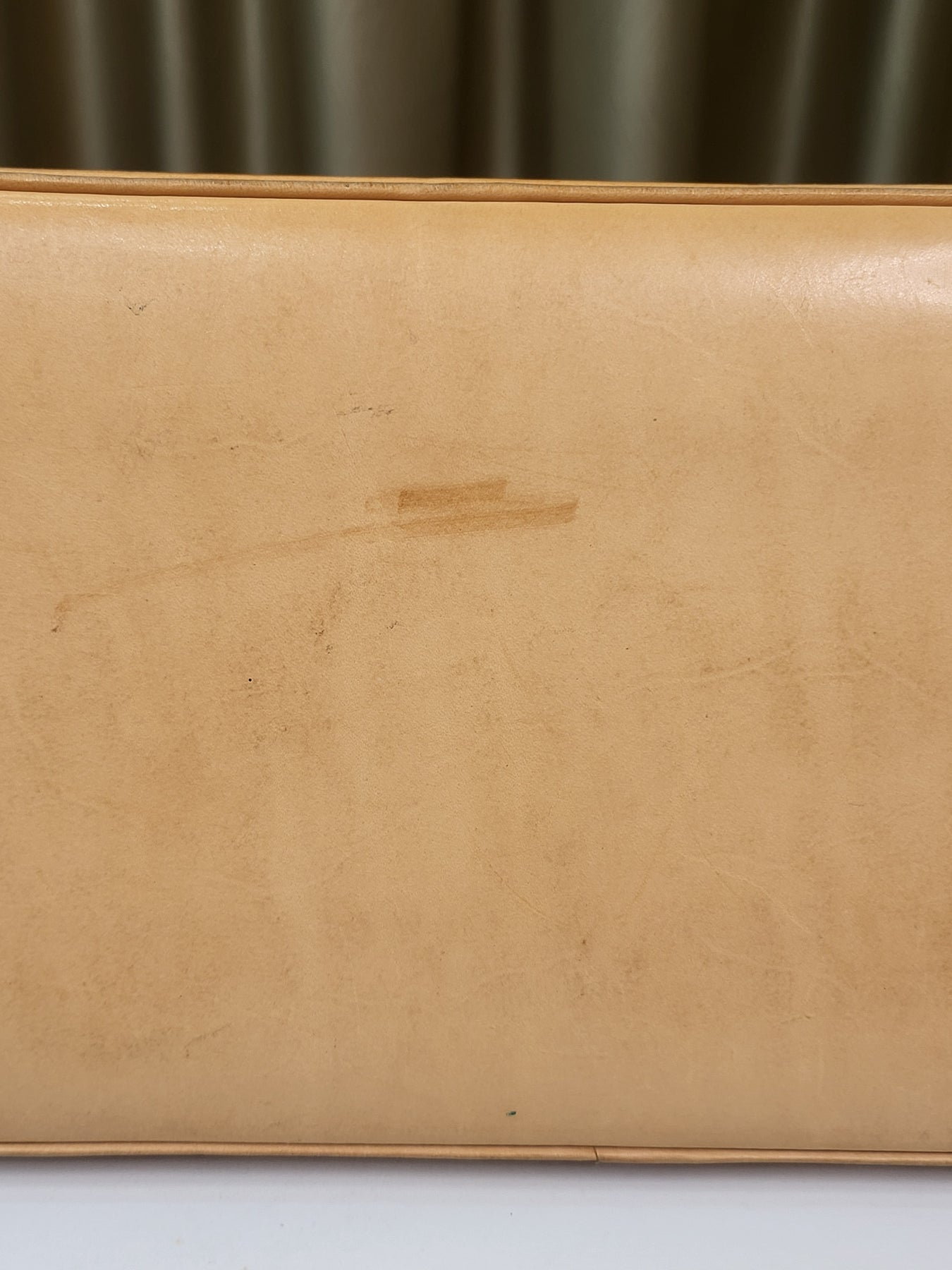 In well-used condition with visible watermark stains on exterior vachetta leather